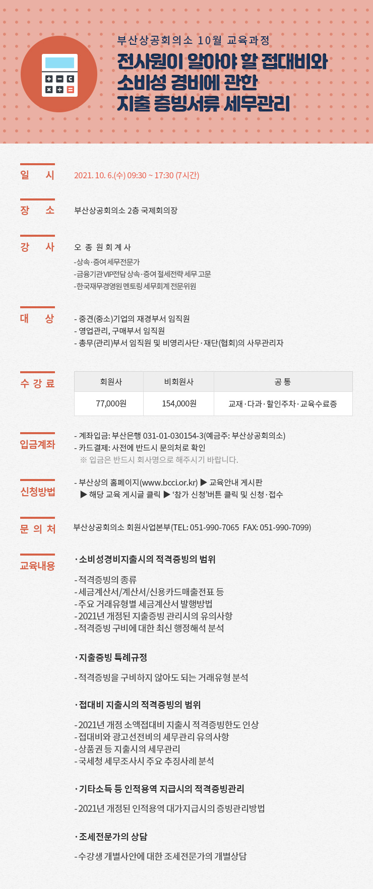 - 수강료 카드결제는 온라인 참가신청 후, 전화(Tel. 051-990-7065)로 사전등록 하시면 됩니다.