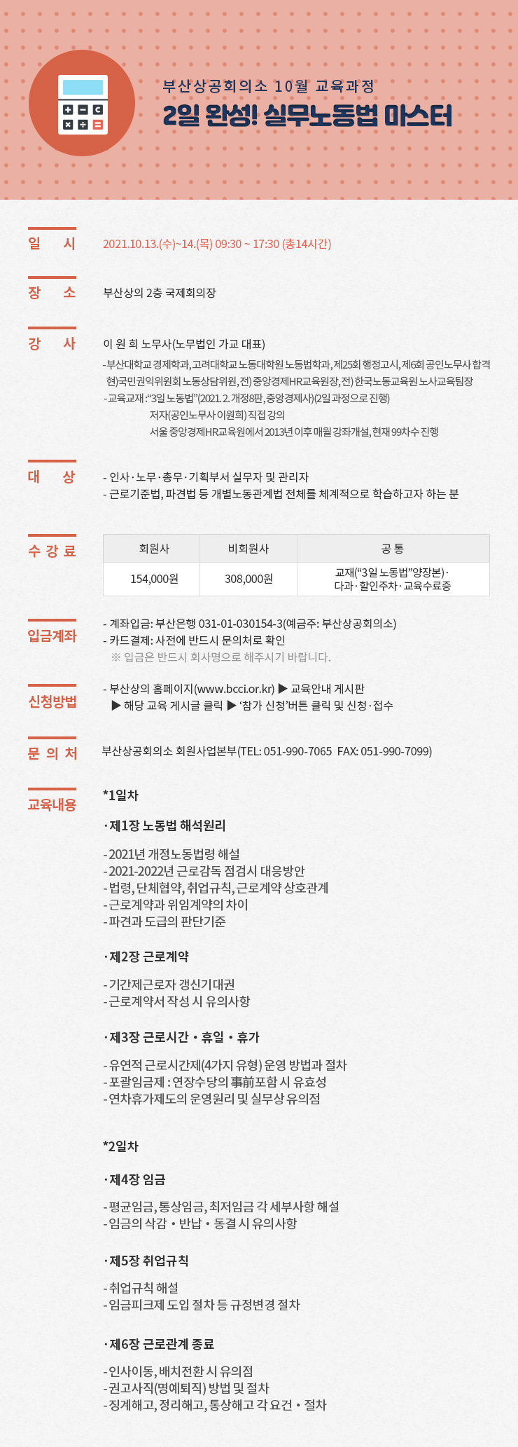 - 수강료 카드결제는 온라인 참가신청 후, 전화(Tel. 051-990-7065)로 사전등록 하시면 됩니다.