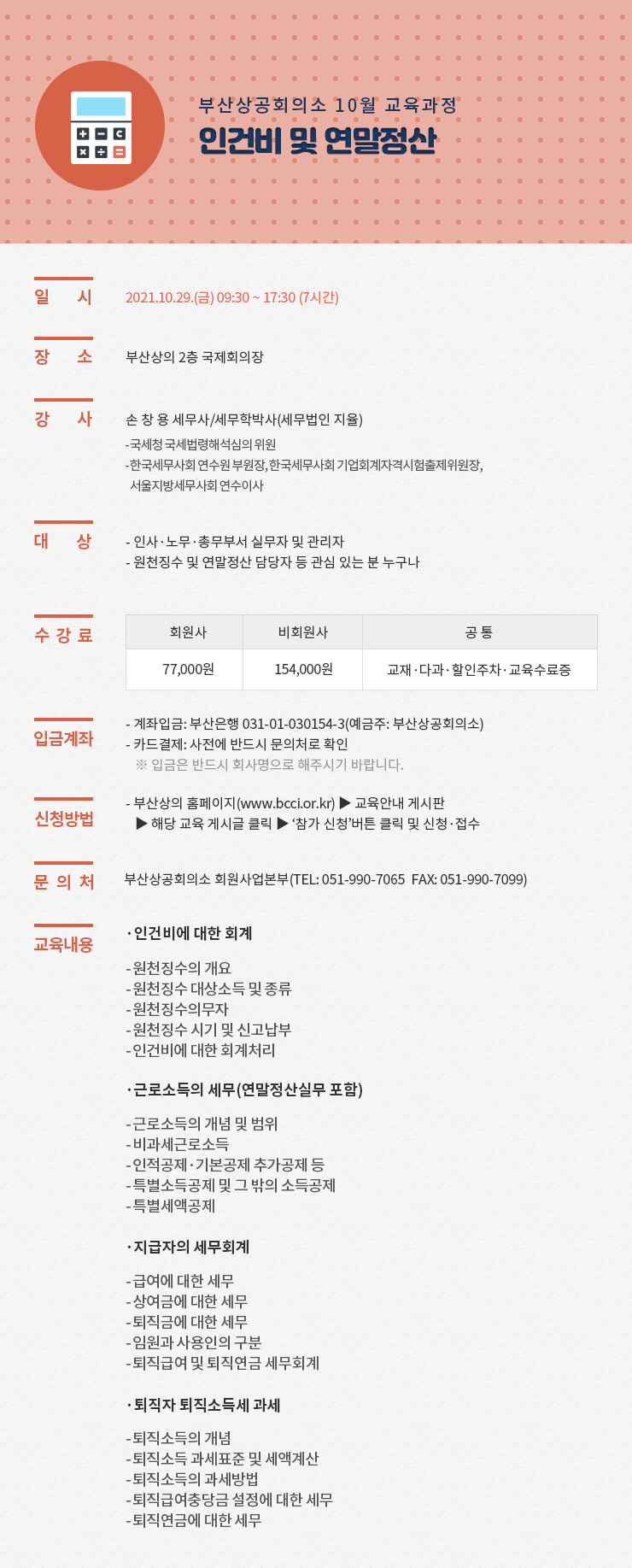- 수강료 카드결제는 온라인 참가신청 후, 전화(Tel. 051-990-7065)로 사전등록 하시면 됩니다.
