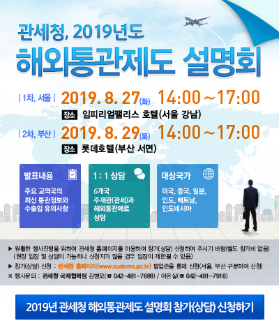 관세청은 해외통관애로 발생 등으로 어려움을 겪고 있는 수출기업 및 해외 현지 진출기업들을 지원하기 위해 해외 주재 관세관 등이 참석하는 해외통관제도 설명회 및 상담회를 개최하오니, 관심있는 업체들은 적극 참석하시기 바랍니다.