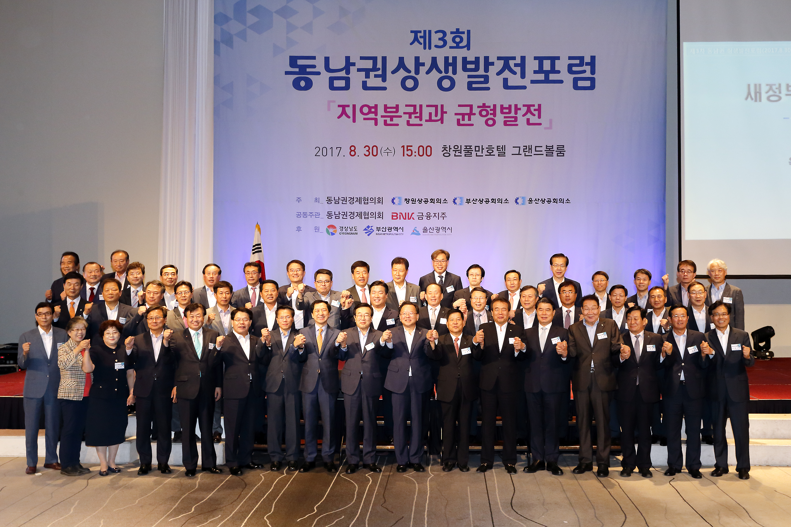 동남권경제협의회(공동의장 부산·울산·창원상공회의소 회장)는 지난 8월 30일(수) 오후 3시 창원풀만호텔 그랜드볼룸에서 ‘지역분권과 균형발전’이라 는 주제로 제3차 동남권상생협력포럼을 개최했다. 수도권과 함께 우리나라 경제의 한 축을 이루고 있는 동남권의 주체들이 긴밀한 협력 속에 상호 성장을 이루자는 취지로 개최한 이날 행사에는 부산· 울산·창원상공회의소 회장을 비롯한 상공인, 부·울·경 광역단체장, 창원시장, 언론사대표, 시민단체 등 200여 명이 참석했다. 이번 행사에 기조연설자로 나선 김부겸 행정안전부 장관은 ‘지방분권·균형발전 비전과 전략’이란 주제의 연설에서 “저성장의 늪에 빠진 경제와 심화되 는 지역 간 재정격차, 소득 불평등, 청년실업률 등 대한민국은 지금 위기상황에 직면해 있지만 기존의 정치는 이를 해결하지 못했다.”고 진단하고, “지 방분권을 통한 국가균형발전은 수도권과 지방이 상생하고 협력하며 지속가능한 발전을 이룰 수 있는 최고의 국가발전전략이다.” 말하며 연방제에 준 하는 강력한 지방분권, 전국이 골고루 잘 사는 대한민국 등 두 가지 비전을 제시했다. 연방제에 준하는 강력한 지방분권을 언급하며, ▲중앙권한의 획 기적 지방이양, ▲자주적인 지방재정 확충, ▲자치단체의 자치역량 제고, ▲풀뿌리 주민자치 기반 강화, ▲지방분권형 개헌 추진에 대해 설명했다. 또 전국이 골고루 잘 사는 대한민국이란 비전을 제시하며 새정부와 행정안전부의 균형발전 추진전략을 설명했다. 이어 옥원호 경남대학교 행정학과 교수가 ‘새정부의 분권·자치·분산’이란 제목으로 1주제를 발표했다. 옥원호 교수는 지방분권의 의미와 역사성, 당위 성을 설명하고, 역대 정부의 지방분권 정책성과에 대해 논하며, “경제의 세계화와 정치의 지방화는 세계적인 추세이며, 책무성과 접근성의 강화와 자 원배분의 효율화는 지방분권이 가진 가장 큰 장점이다.”고 주장하는 한편, “지방분권이 새정부의 5대 국정목표 중 하나인 만큼 과감한 개혁과 공적인 협력구조의 형성과 더불어 중앙정부의 흔들림 없는 정책 추진이 필요하다.”고 말했다. 2주제 발표에 나선 김해두 재료연구소 소장은 ‘동남권 첨단소재 육성방안’을 주제로 발표했다. 김해두 소장은 동남권 제조업의 성장동력 약화와 글로 벌 패러다임의 전환위기진단을 통해 문제를 제기하고, 동남권의 신성장동력으로 첨단소재의 육성에 집중해야 함을 강조했다. 김 소장은 “새정부의 동 남권 발전비전은 소재혁신과 밀접한 관련이 있다.”고 언급하며, “경남의 우주항공산업·기계산업 ICT융복합·항노화산업, 부산의 해양산업 클로스터 육 성, 울산의 3D프린팅 산업 육성 등은 모두 소재연구와 산업의 뒷받침 없이는 효과를 거두기 힘든 산업들이다.”고 말하며, 소재산업 육성의 필요성을 강 조했다 토론에서는 송광태 창원대학교 행정학과 교수를 좌장으로 김재홍 울산대학교 사회과학부 교수, 최우용 동아대학교 법학전문대학원 교수, 김철 진 경상대학교 신소재공학부 교수, 송부용 경남발전연구원 연구위원이 토론자로 나서 열띤 토론을 이어갔다.