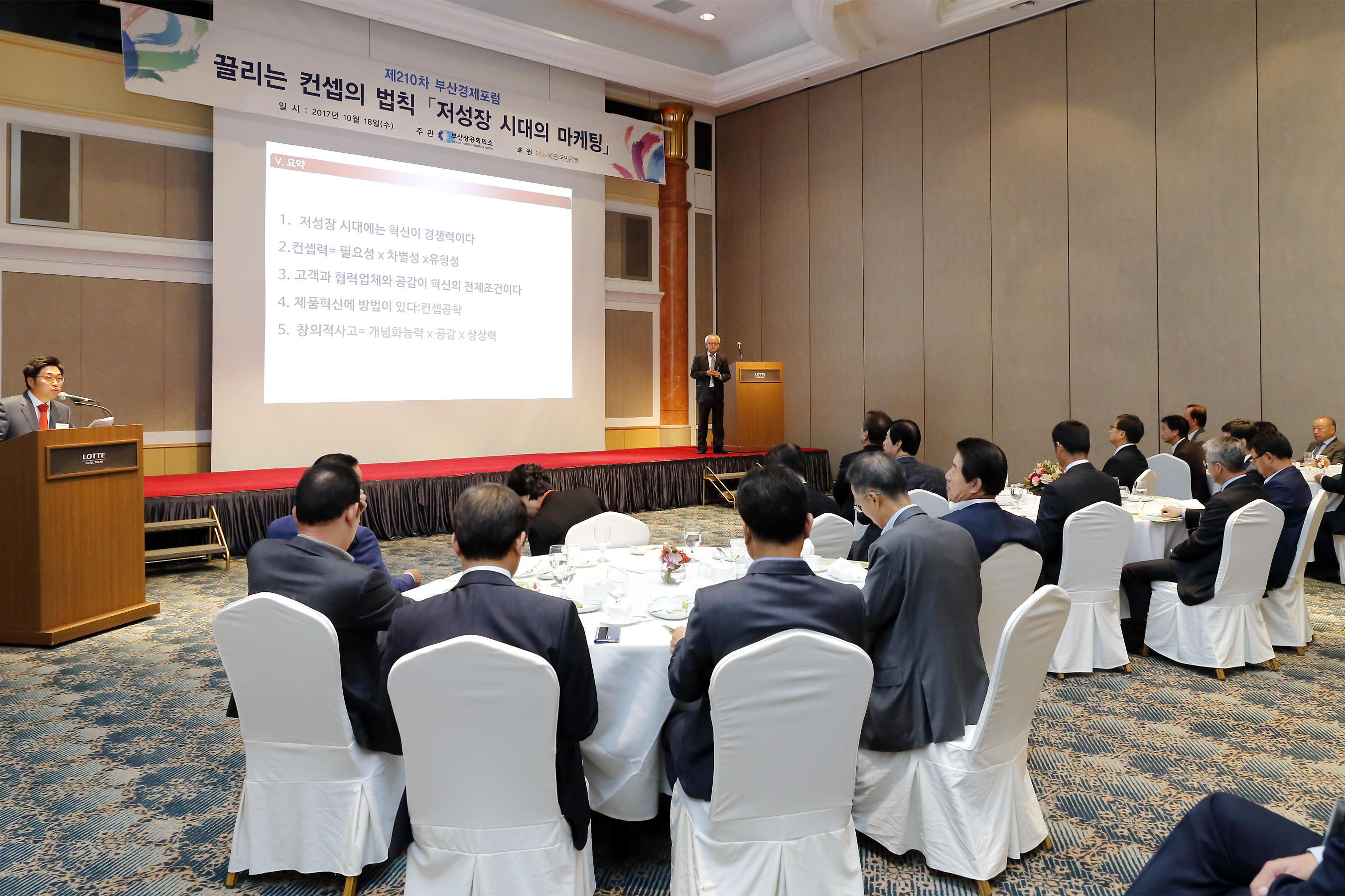 부산상공회의소가 주최하고 KB국민은행이 후원하는 ‘부산경제포럼’세미나가 지난 10월 18일(수) 오전 7시 부산롯데호텔에서 부산상의 임원과 지역 기업인, 경제 유관기관 단체장 등 회원 150여명이 참석한 가운데 개최됐다. 이번 세미나는 김근배 숭실대학교 교수가 강연자로 나서 끌리는 컨셉의 법칙, 『저성장 시대의 마케팅』 이라는 주제로 강연을 진행했다.