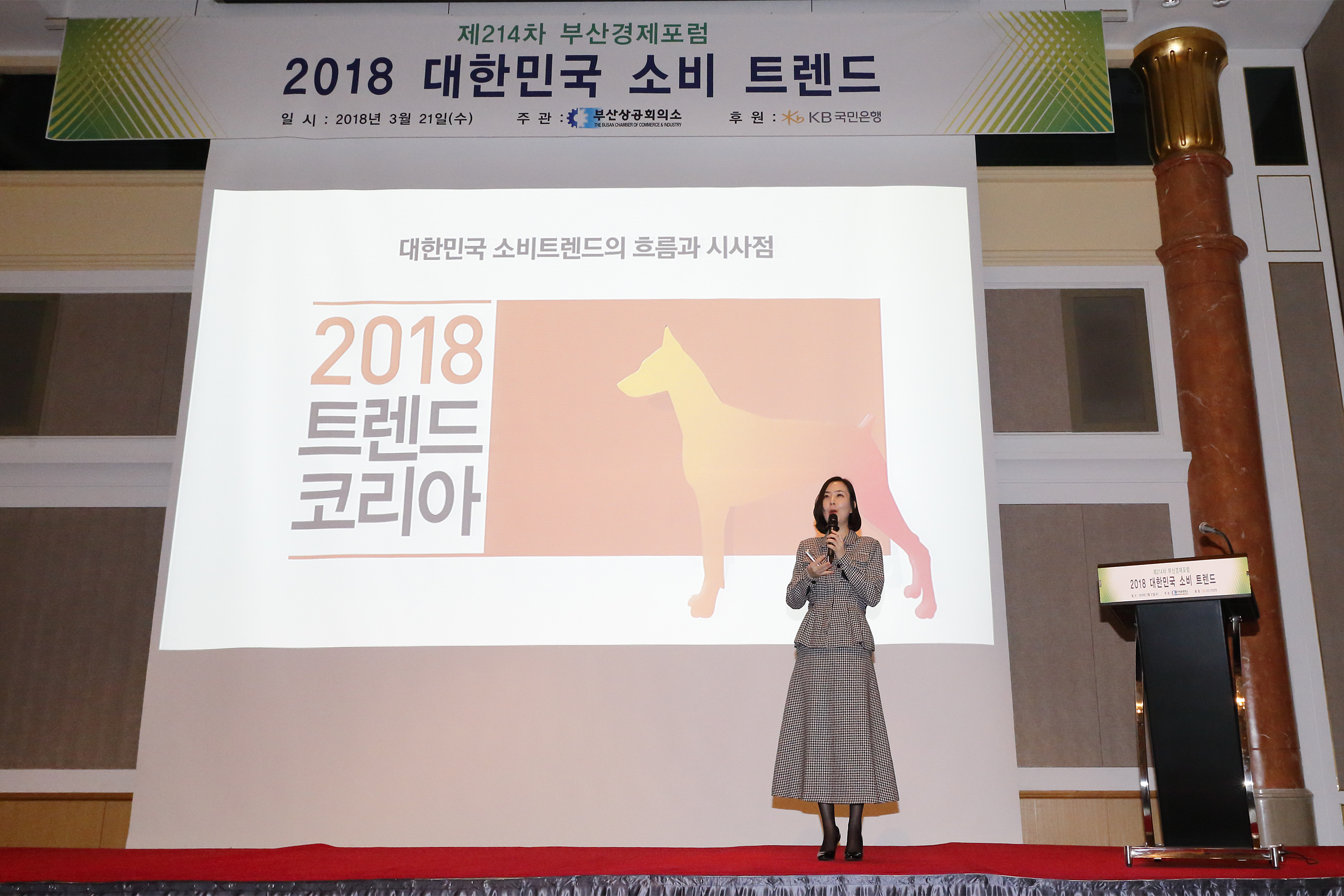 부산상공회의소가 주최하고 KB국민은행이 후원하는 ‘부산경제포럼’ 세미나가 지난 3월 21일(수) 오전 7시 부산롯데호텔에서 부산상의 임원과 지역 기업인, 경제 유관기관 단체장 등 회원 150여명이 참석한 가운데 개최됐다. 이번 세미나는 성신여대 이향은 교수가 강연자로 나서 『2018 대한민국 소비 트렌드』라는 주제로 강연을 진행했다.