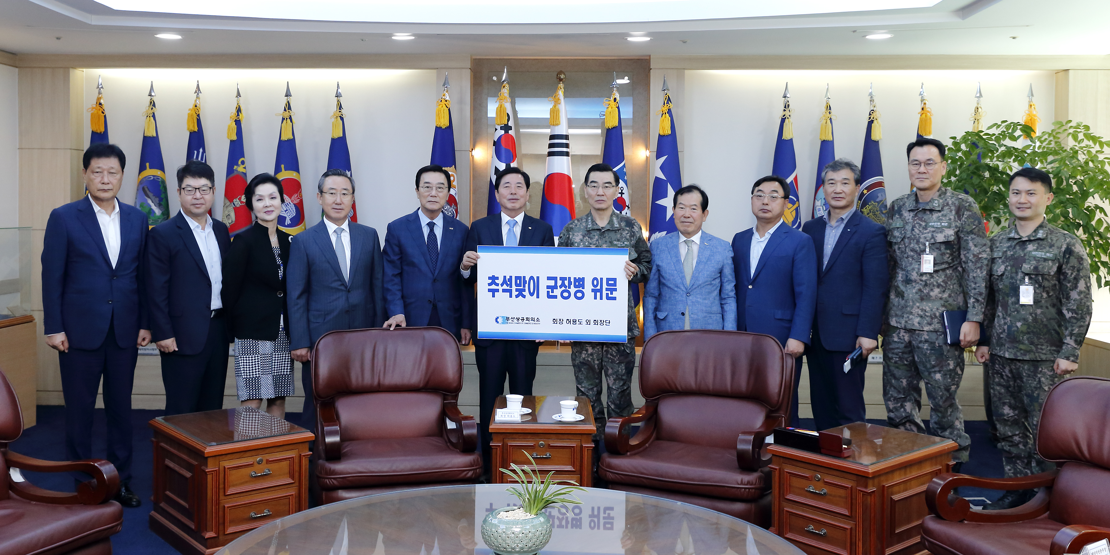 부산상공회의소 허용도 회장을 비롯한 회장단은 지난 9월 17일 추석을 맞이하여 향토방위에 만전을 기하고 있는 지역 내 군부대를 방문해 군장병 들을 격려했다. 부산상의 회장단은 지역방위를 수호하고, 시민들의 안위를 위해 밤낮가리지 않고 애쓰는 군장병 들의 노고에 감사의 뜻을 전하고, 위문금을 전달 했다. 이날 군부대 위문에는 부산상의 허용도 회장과 이남규, 백정호, 박수복, 송정석, 오형근, 유재진, 김경조, 오용범 부회장과 이갑준 상근부회장, 이병곤 사무처장 등이 동행했다.