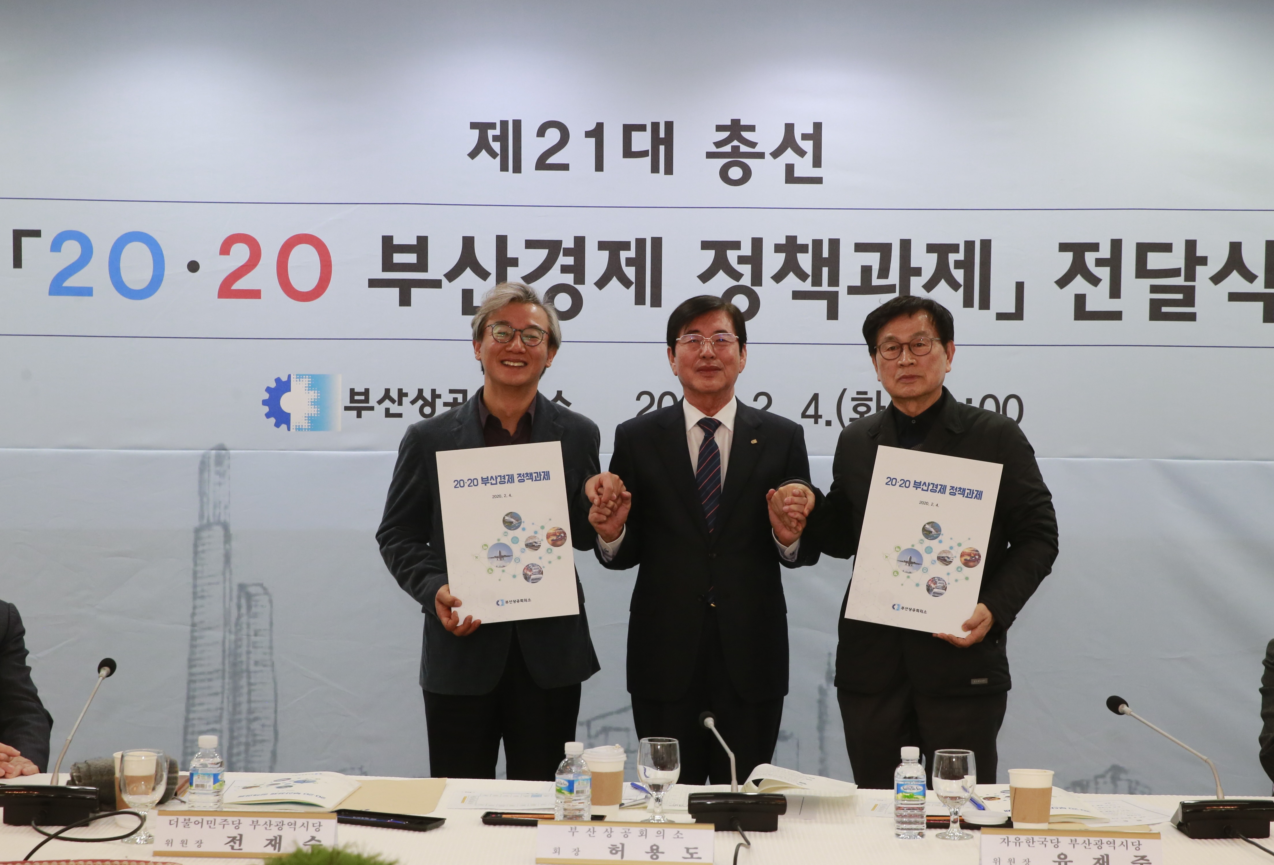부산상공회의소는 지난 2월 4일 11시 부산상의 2층 국제회의장에서 더불어민주당과 자유한국당을 초청하여, 부산경제 미래성장 전략과 기업활력 제고 핵심내용을 골자로 하는‘21대 총선 20·20 부산경제 정책과제 전달식’을 개최하였다.
