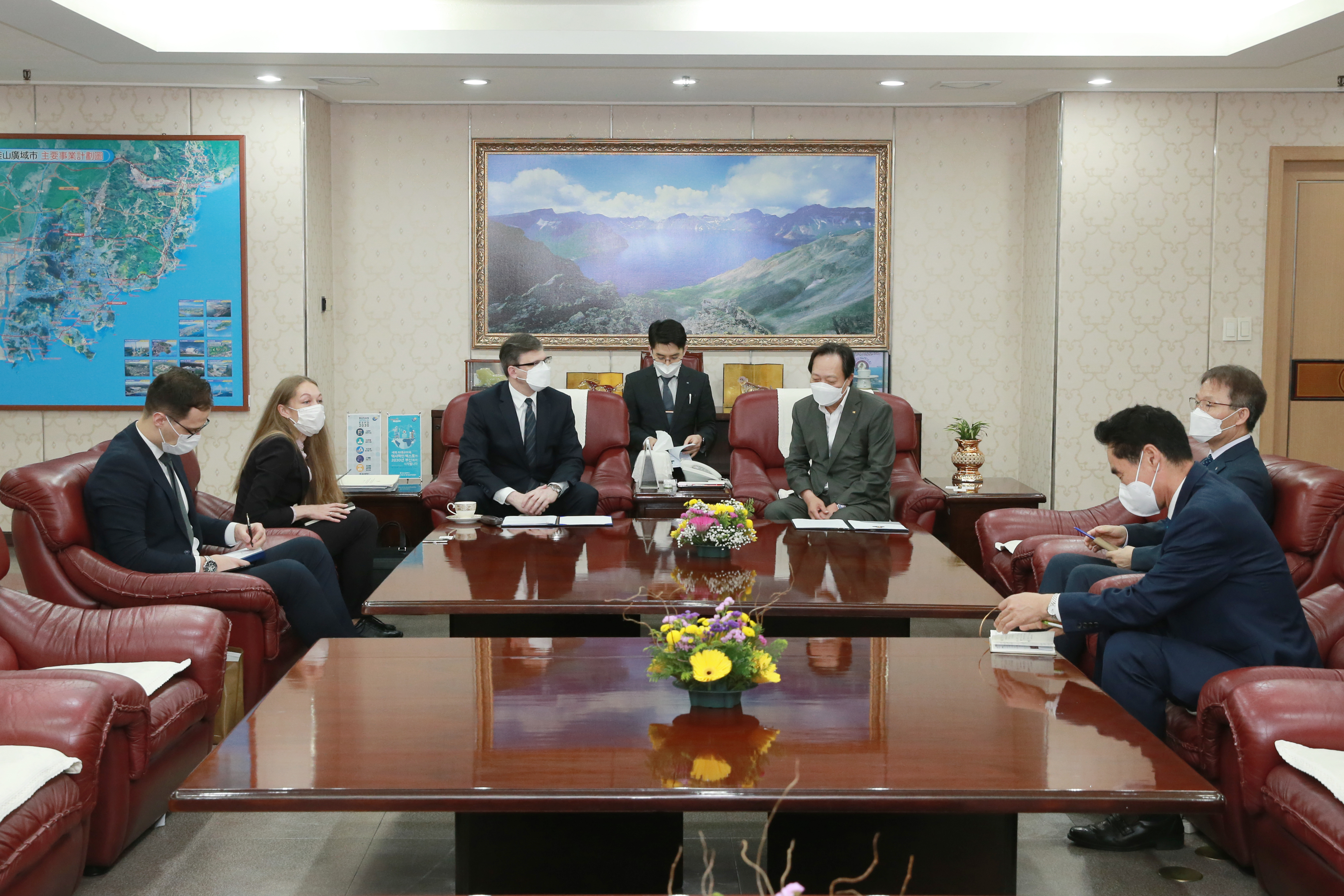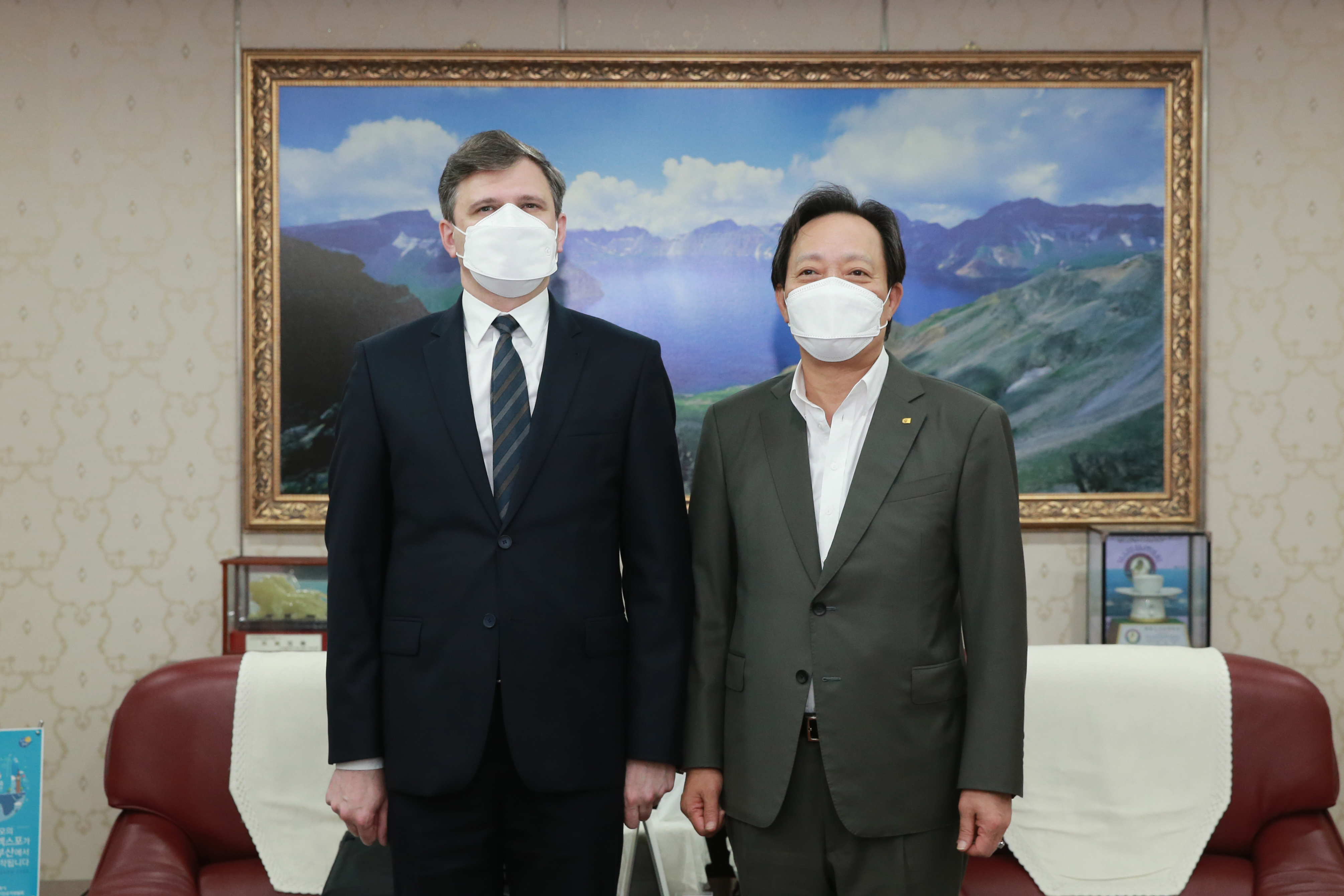 주한 벨라루스 안드레이 폽코브 대사와 올가 오즈갈로 상무관, 발레리 프랄로브스키 상무관이 17일(월) 14시 부산상공회의소를 방문했다.